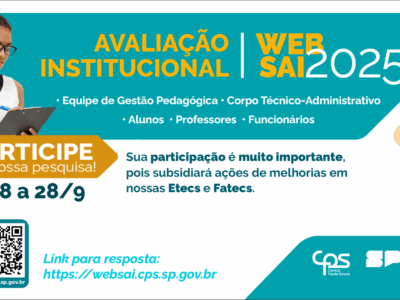 Caros alunos!!! Você está sendo convidado a participar da pesquisa de Avaliação Institucional – WebSai 2025. Mais uma vez estamos prontos para ouvi-los nessa pesquisa, pois o Centro Paula Souza mantém e valoriza a comunicação com a comunidade […]